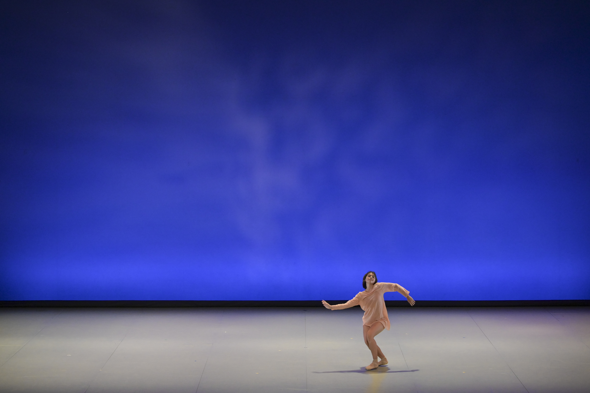 Live performance of a ballet pice, infant of a blue background, costumes Made by atelier dreisieben, schneiderei Hamburg