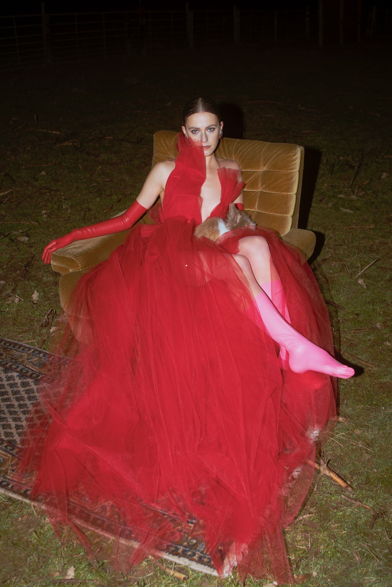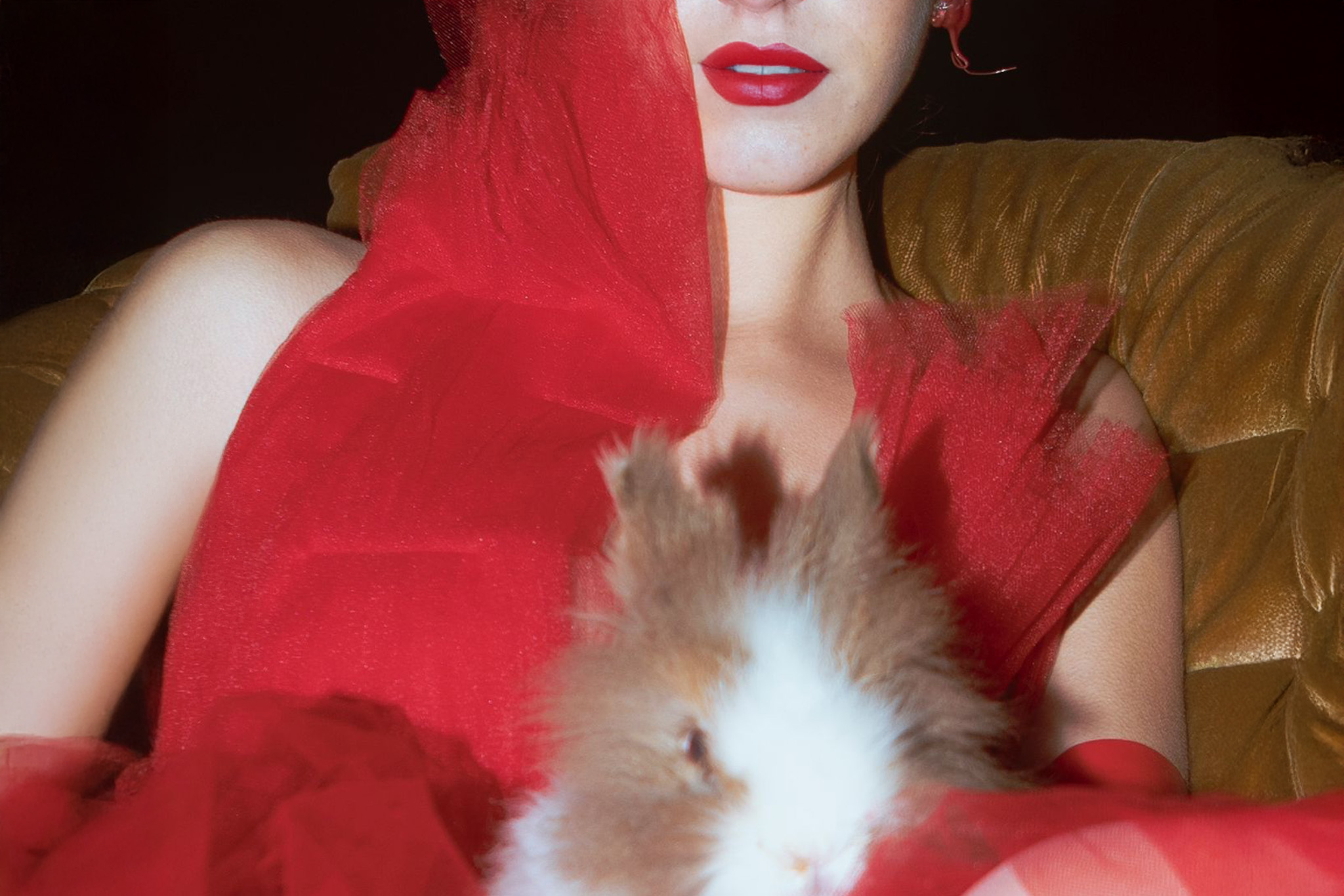Woman in a red elegant dress sitting on a chair holding a little bunny, made by schneiderei Hamburg, atelierdreisieben